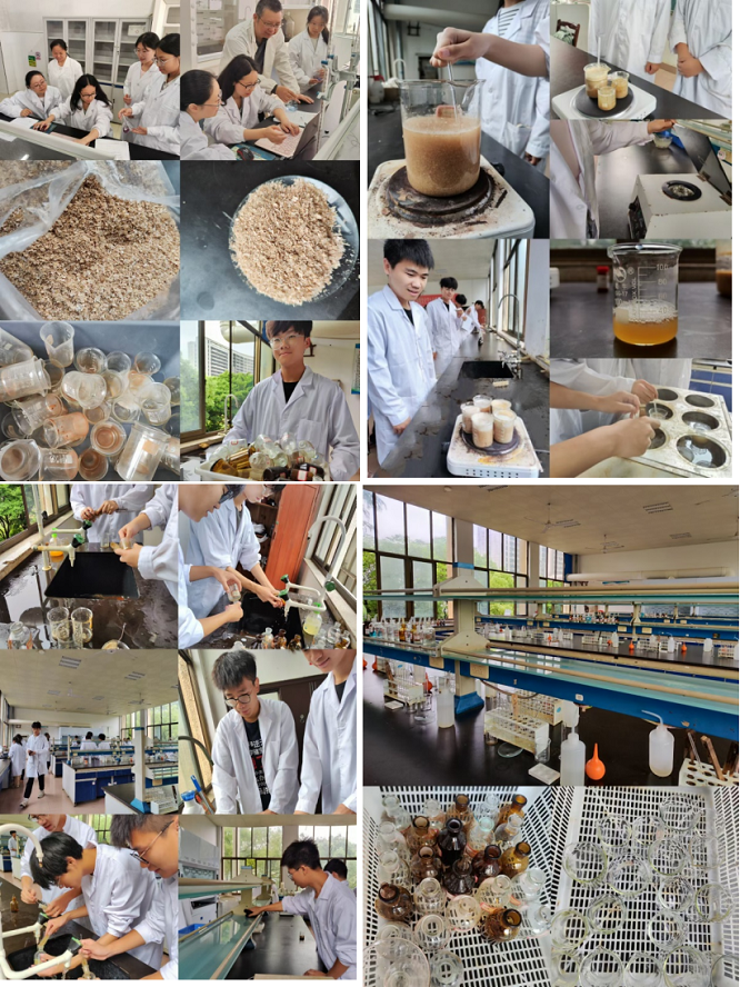 活动前期,材料2301班的同学们利用图书馆、网络等渠道深入开展了文献调研工作,广泛收集国内外关于农林废弃物合成制备表面活性剂的研究资料,对反应原理、技术路线、实验方法等进行全面梳理。指导老师采购了实验药品,准备了相关实验设备及仪器。活动阶段,同学们按照既定方案,开始探索如何利用农林废弃物小麦麸皮合成表面活性剂通过反复试验不断优化反应条件,最终从小麦麸皮中提取出了具有优异性能的表面活性剂并用作洗涤剂接着,同学们利用自己制作的洗涤剂,对无机实验室的试剂瓶、烧杯、锥形瓶玻璃仪器及实验桌,试剂架,地面等进行了全面清洗。同学们分工协作,有的负责洗刷,有的负责清洗有的负责擦桌子拖地,现场一片繁忙而有序的景象。经过学生们的辛勤劳动,原本沾满污渍的实验仪器变得焕然一新,整个实验室变得干净整洁