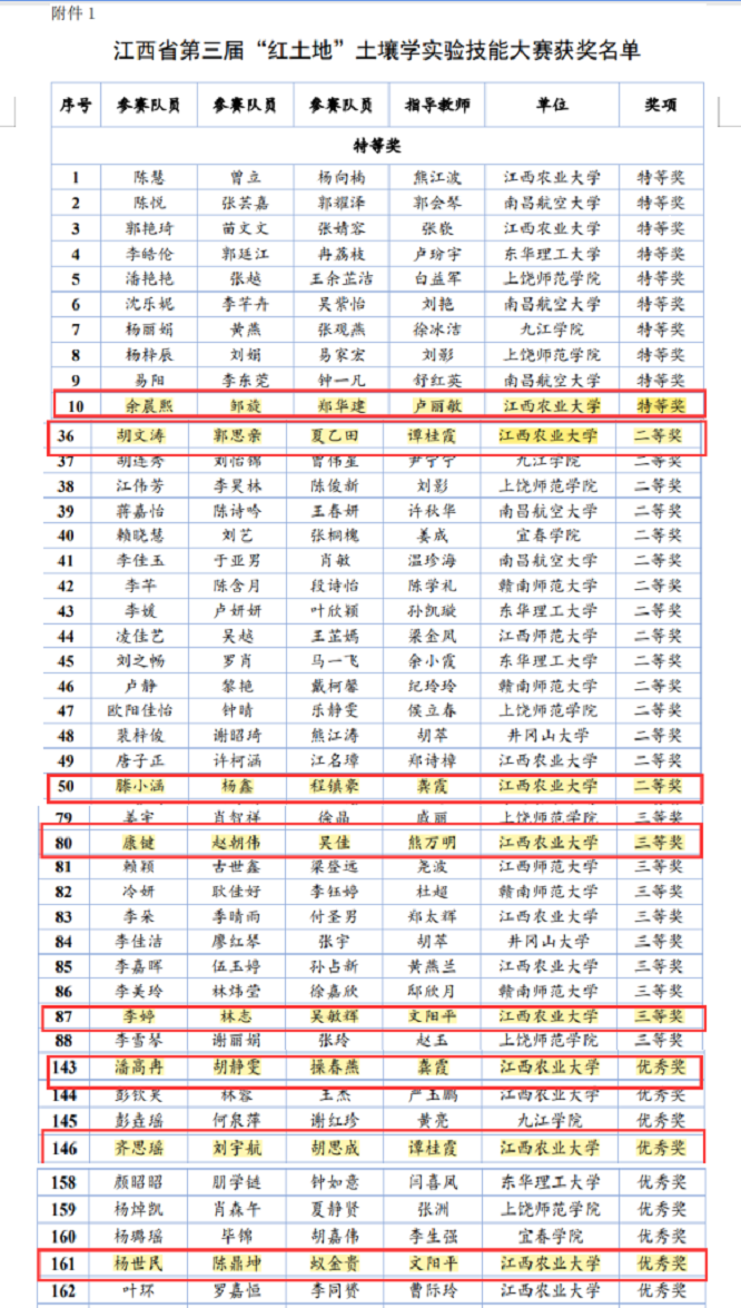 2023年12月11日,江西省土壤科学技术学会公布了江西省第三届“红土地”土壤学实验技能大赛获奖名单,必赢官网8支参赛队伍榜上有名,其中特等奖1项,二等奖2项,三等奖2项,优胜奖3项。卢丽敏老师指导的学生团队获得特等奖,谭桂霞老师指导的学生团队分别获二等奖和优秀奖,龚霞老师指导的学生团队分别获得二等奖和优秀奖,熊万明老师指导的学生团队获得三等奖,文阳平老师指导的学生团队分别获三等奖和优秀奖。