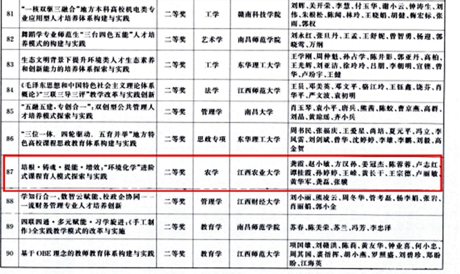 2023年12月29日,江西省人民政府文件(赣夫3字[2023]88号)公布了关于2022年江西省教学成果奖授奖决定。必赢官网龚霞教授团队的教学成果“培根· 铸魂·提能·增效:“环境化学”进阶式课程育人模式探索与实践”获得江西省高等教育类(本科层次)教学成果奖二等奖,是我校5项江西省教学成果奖中唯一一个基于单门课程的教学成果奖。