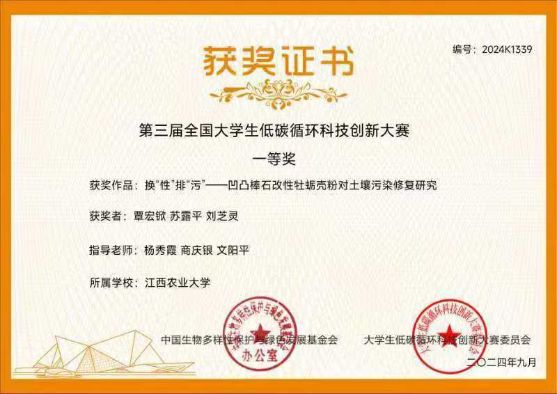 据悉,文阳平老师参与指导的《换“性”排“污”-凹凸棒石改性牡蛎壳粉对土壤污染修复研究》在本次大赛中荣获一等奖,胡飞扬、龚磊老师指导《农林生物炭基催化剂的构筑及其催化二氧化碳甲烷化的机制研究》荣获二等奖,熊万明、吴苏琴老师指导《桐子壳炭基固体酸催化餐饮废弃油转化生物柴油》荣获三等奖。本次比赛经评委专家初赛网络评审和决赛现场答辩,在激烈的竞争中脱颖而出,取得了优秀成绩。