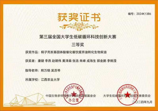 2024年9月10日,由中国生物多样性保护与绿色发展基金会(国家一级学会)主办的第三届大学生低碳循环科技创新大赛圆满落幕。必赢官网教师指导的项目团队在本次大赛中表现突出,在本科生组--实验研究类赛道中荣获一等奖1项、二等奖1项、三等奖1项。