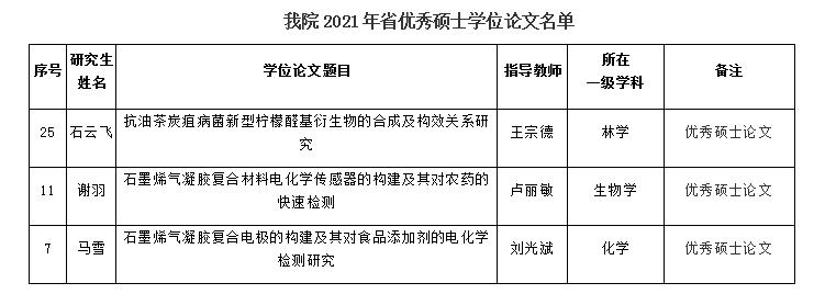 近日,江西省学位办公布了2021年全省优秀博士硕士论文入选名单,必赢官网王宗德教授、卢丽敏教授、刘光斌副研究员分别指导的研究生石云飞同学、谢羽同学、马雪同学的学位论文入选为江西省优秀硕士学位论文。这充分体现了必赢官网注重研究生培养过程管理,加强研究生学位论文质量建设,切实保障了硕士学位论文质量。