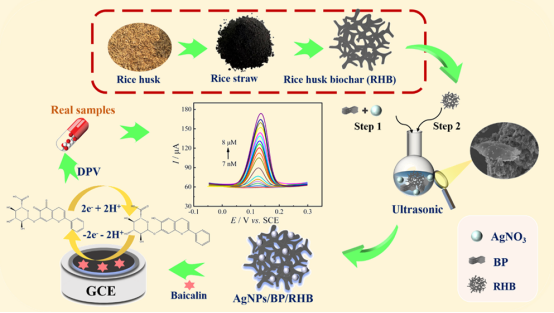 黄芩苷作为传统中药黄芩的标志性黄酮类成分,其精准定量对中药制剂的抗炎、抗氧化药效评价至关重要。然而,传统检测方法如高效液相色谱(HPLC)存在样品前处理繁琐、仪器成本高昂等局限,难以满足现场快速检测需求。黑磷烯(BP)因独特的二维层状结构和高载流子迁移率,成为电化学传感的理想材料,但其在空气中易被氧化降解的缺陷长期制约实际应用。该研究提出双功能界面调控理念:利用AgNPs的量子限域效应占据BP表面氧化活性位点,同时通过稻壳生物炭RHB的多孔碳骨架增强 π-π 电子共轭传输,二者协同将 BP 的环境稳定性提升至 16 天以。该复合材料RHB-BP-AgNPs修饰的玻碳电极对黄芩苷的检测限低至 5.45 nMS/N=3),线性响应范围覆盖 0.007-8.0 μm。在清开灵颗粒等实际药样检测中,加标回收率达 95.4-104.6%,相对标准偏≤2.13%,验证了其在复杂中药基质中的适用性。