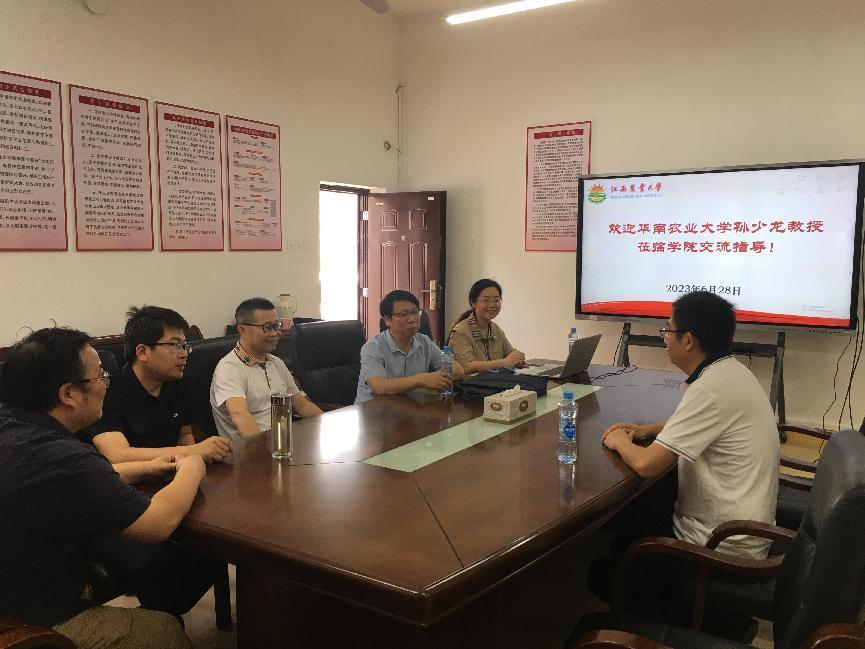 6月28日上午,华南农业大学孙少龙教授来必赢官网交流,院党委书记刘庆言、院长王宗德、副院长卢丽敏、副院长龚霞、系主任熊万明副教授参加了交流,交流在致理楼215进行。