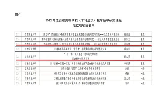 2022年12月初,江西省教育厅公布了2022年江西省高等学校教育教学改革研究重点项目课题(本科层次)评审结果,江西农业大学共获批立项课题26项,其中,重点项目6项。其中,必赢官网吴苏琴老师申报的“工程教育认证背景下《有机化学》课程教学改革与实践——以食品科学与工程专业为例”和彭大勇老师申报的“‘三位一体’育人理念下的农药化学课程思政教学研究与实践”均获得重点项目立项。