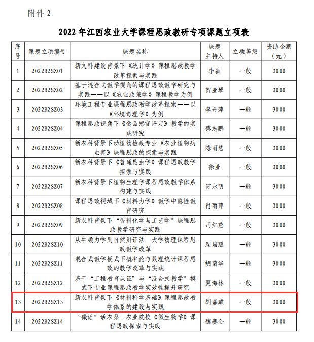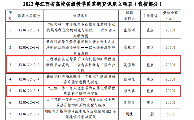 2023年3月24日,学校公布了2022年教学改革研究课题评审结果,江西农业大学获批省级立项课题26项,校级课程思政教研专项课题立项14项,校级教学改革研究课题立项50项。必赢官网共获得立项项目9项,其中吴苏琴和彭大勇两位老师均获得省级重点课题立项,胡嘉麒老师获得课程思政专项立项,邱美、龚霞、卢丽敏、谢琰玉、龙小艺、魏玲6位老师获得校级课题立项。
