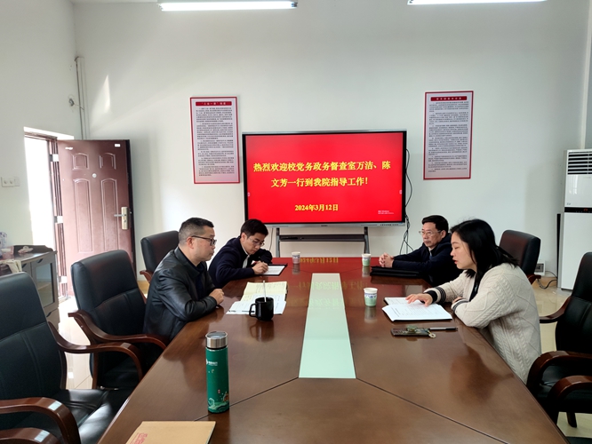 2024年3月12日10:00,学校党务政务督导组副主任万洁、正处级督导员陈文芳到必赢官网开展学校第四次党代会氛围营造和中共中央颁布“三个条例”学习宣传情况专项督查,院党委书记刘庆言、学生党总支书记彭玉萌及党委组织员廖超参与本次督查座谈会,会议由刘庆言主持。