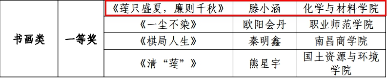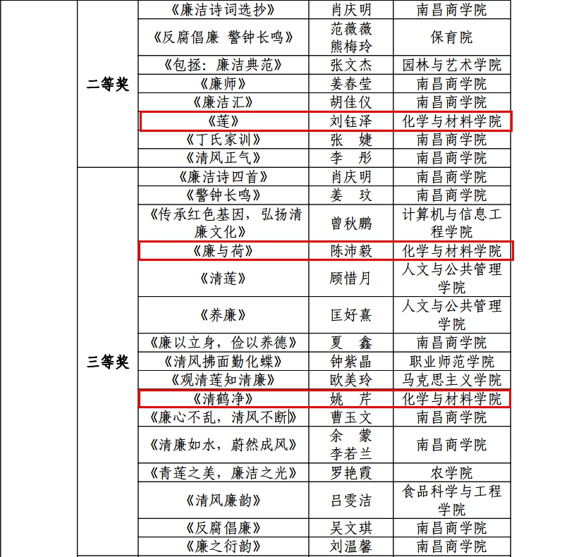 近日,校纪委、省监委驻学校监察专员办公室联合发文《关于公布2024年校园廉洁文化作品征集活动获奖名单的通知》,必赢官网师生报送的多项作品获奖。其中,学院团委书记韩柳报送的视频作品《共产党人的正气歌》《十七棵松》分别荣获视频类作品一等奖及三等奖,应化2203班滕小涵作品《莲只盛夏,廉则千秋》荣获书画类作品一等奖,应化2202班刘钰泽作品《莲》荣获书画类作品二等奖,材料2302班陈沛毅作品《廉与荷》及应化2202班姚芹作品《清鹤净》荣获书画类作品三等奖。