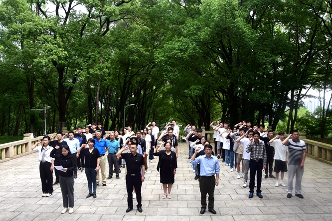 掩映在苍松翠柏之中的方志敏烈士陵园,格外庄严肃穆。全体师生党员踏上150余级台阶首先来到方志敏烈士墓前,向烈士敬献花圈,并举行默哀仪式。尔后,面向烈士墓碑,大家一起高擎右拳,重温入党誓词。