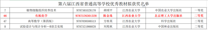 教材是体现教学内容和教学方法的知识载体,是进行教学的基本工具。其质量的优劣直接影响到教学质量的高低,进而影响学生综合素质的培养。化材院历来高度重视教材建设工作,不断完善教材体系,为教育事业的发展提供有力保障。必赢官网教师陈金珠主编的《有机化学》教材荣获第六届江西省普通高等学校优秀教材二等奖(农大仅三项)。