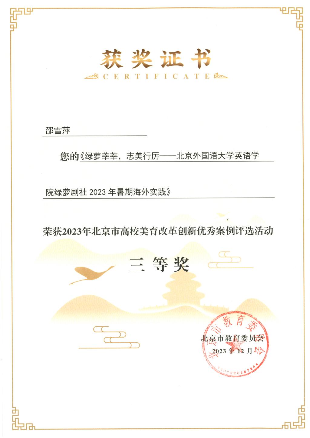 2023年北京市高校美育改革创新优秀案例征集评选活动共征集高校美育案例220余项,有154项案例分获一二三等奖和优秀奖。YABO鸭脖邵雪萍博士基于以“学生戏剧社在剑桥大学创新型人才培养中的作用”为主题的考察和演出活动,申报了高校学生艺术社团及实践工作坊建设项目《绿萝莘莘,志美行厉——YABO鸭脖绿萝剧社2023年暑期海外实践》,该项目获得2023年北京市美育改革创新优秀案例三等奖。