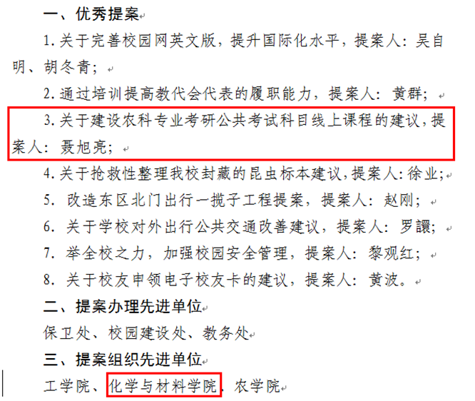 必赢官网党政领导历年来都非常重视“双代会”提案工作,要求每位“双代会”的代表们至少提出一个提案,要求“双代会”的代表们以高度的主人翁意识,充分行使职权,切实履行职责,深入调查研究,广泛征求意见,就学校发展重大问题和涉及师生切身利益的实际问题积极建言献策,助推学校事业健康持续发展。2023年必赢官网“双代会”代表们共提交7份优质提案,聂旭亮代表提出的“关于建设农科专业考研公共考试科目线上课程的提案”的提案获评优秀提案,学院分工会获评提案组织先进单位。