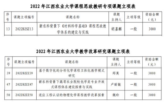 2023年3月24日,赣农大教发[2023]9号文件公布了2022年教学改革研究课题评审结果,2022 年共立项江西农业大学教学改革研究课题 64 项(含课程思政教研专项课题 14 项)。材料与化工支部共获批4项,其中,胡嘉麒主持的“新农科背景下《材料科学基础》课程思政教学体系的建设与实践”获批课程思政教研专项课题,卢丽敏主持的“新农科背景下高等农业院校化学类专业开放式课程体系建设探索与实践”、邱美主持的“基于数字化的分析化学课程立体化教学模式研究”、魏玲主持的“适应工程认证的物理化学课程教学改革探索”分别获批江西农业大学教学改革研究课题。希望材料与化工支部党员再接再厉,再创佳绩!