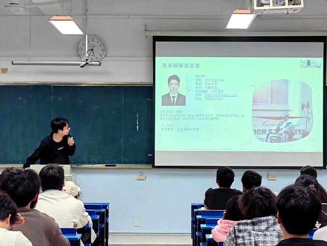 2024年3月24日19时,根据学院统一安排,本科生第一党支部党员唐家新、余晨骁走进新生班晚自习,分享自身学习成长经验。