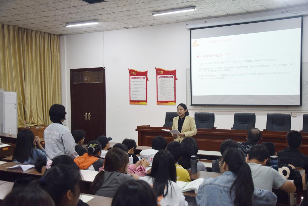 叶健从“入党的标准及条件”、“入党积极分子的培养和考察”和“预备党员的教育、考察和转正”等五个方面大学生入党流程进行了详细讲解课堂上,叶健通过“共和国勋章”获得者张富清和“时代楷模”王继才两位党员坚守初心、不改本色、艰苦奋斗的英雄事迹,勉励新生用青春和热情在生活中扎根,用汗水与坚持在奋斗中抽枝长叶,做到眼中有光、肩上有担、心中有责,争做砥砺奋进、堪当大任的江农青年。