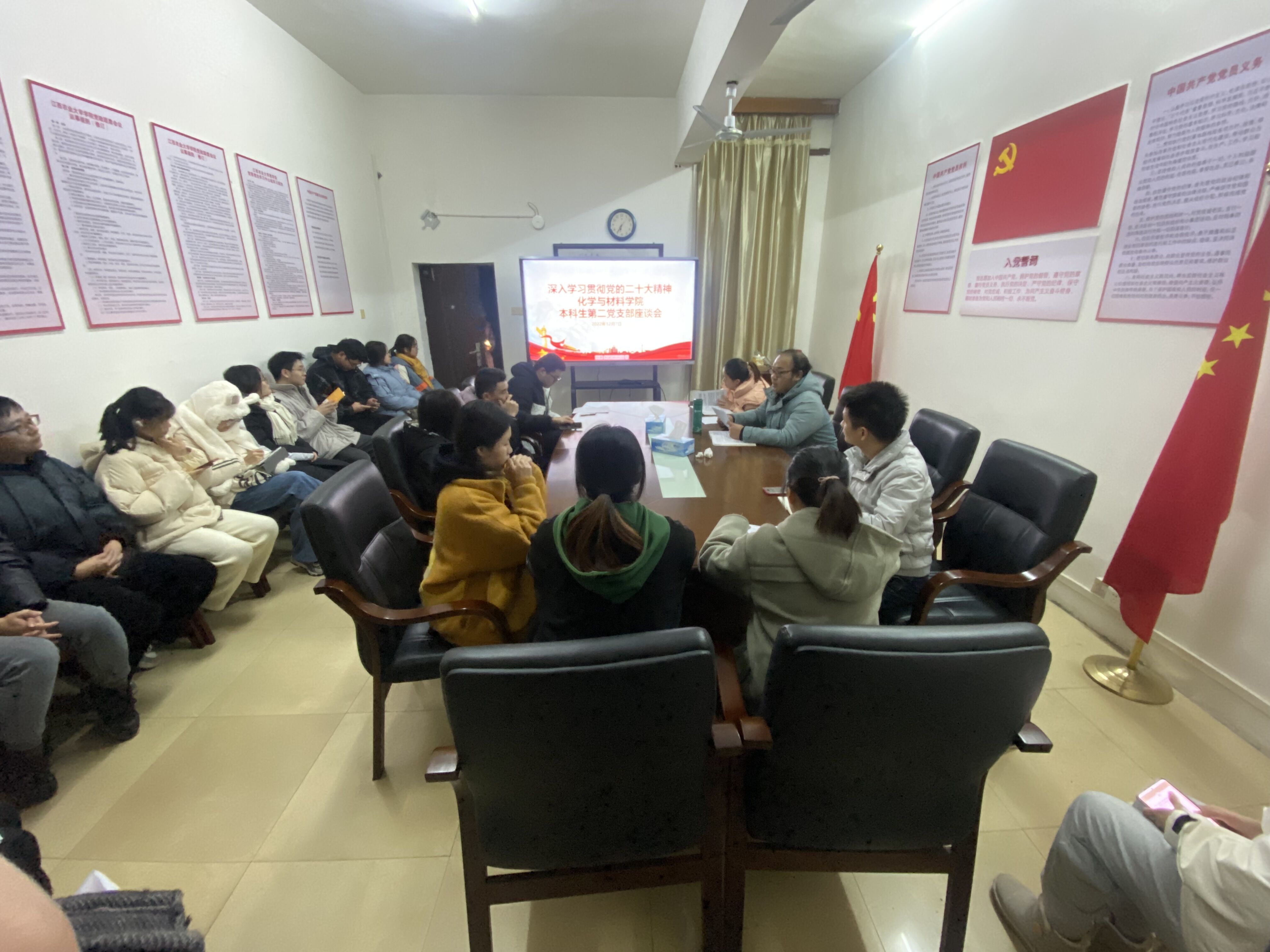 为推进学习贯彻党的二十大精神向纵深发展,2022年12月7日18:30,本科生第二党支部召开党的二十大精神学习座谈会,支部书记廖超作宣讲,全体党员参加。