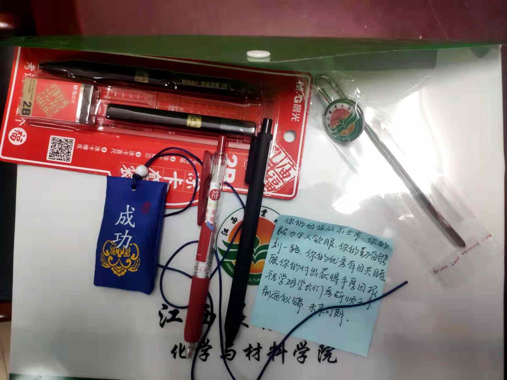 最后,学院全体领导及毕业班班主任为全体考研学生送上了精心准备的“考研大礼包”。考研学子纷纷表示,学院领导老师们的谆谆教诲和精心准备的礼物犹如锦囊妙计让自己在考研的“战役”中更加富有信心和底气,要更加努力拼搏,力争考出优异的成绩。