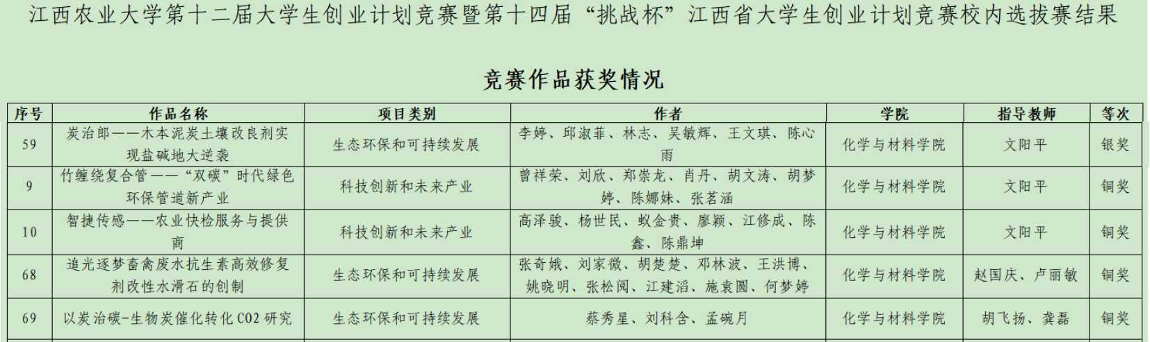 9月3日,第十二届大学生创业计划竞赛暨第十四届“挑战杯”江西省大学生创业计划竞赛校内选拔赛圆满落幕。必赢官网《炭治郎——木本泥炭土壤改良剂实现盐碱地大逆袭》(指导老师:文阳平,团队成员:李婷、邱淑菲、林志、吴敏辉、王文琪、陈心雨)获银奖;《竹缠绕复合管——“双碳”时代绿色环保管道新产业》(指导老师:文阳平,团队成员:曾祥荣、刘欣、郑崇龙、肖丹、胡文涛、胡梦婷、陈娜妹、张茗涵)和《智捷传感——农业快检服务与提供商》(指导老师:文阳平,团队成员:高泽骏、杨世民、蚁金贵、廖颖、江修成、陈鑫、陈鼎坤)获铜奖;《追光逐梦畜禽废水抗生素高效修复剂改性水滑石的创制》(指导老师:赵国庆、卢丽敏,团队成员:张奇娥、刘家微、胡楚楚、邓林波、王洪博、姚晓明、张松阅、江建滔、施袁圆、何梦婷)和《以炭治碳-生物炭催化转化CO2研究》(指导老师:胡飞扬、龚磊,团队成员:蔡秀星、刘科含、孟碗月)获铜奖。此外,必赢官网获优秀组织奖,学工办邓雪云老师获大赛组织先进个人奖。