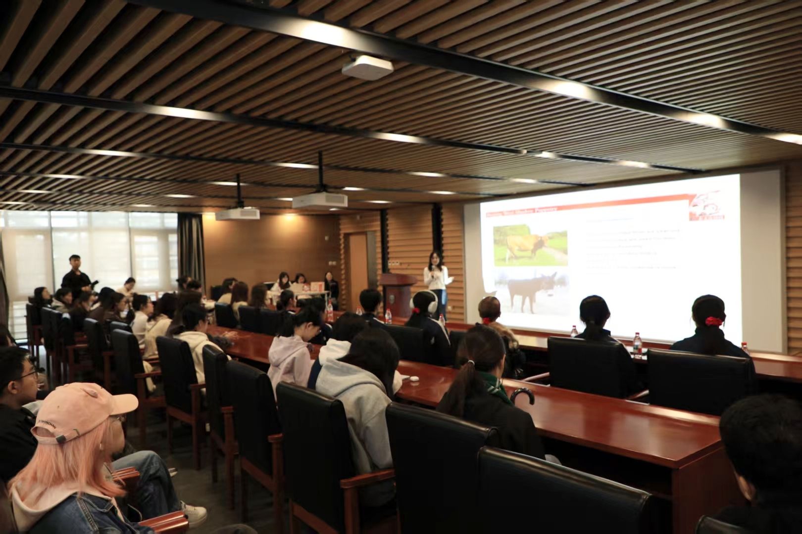 活动伊始,主持人屈慧茹用英语致辞,向远道而来的美国师生表示热烈欢迎,并介绍了皮影戏作为中国非物质文化遗产的历史价值与现实意义。随后韩子萌同学以流利的英文讲解了皮影的历史渊源与制作工艺,从选皮、雕刻到染色、定型,细致展现了皮影从原材料到艺术品的蜕变过程,彰显了学生党员在文化传播中的专业素养与使命担当。
