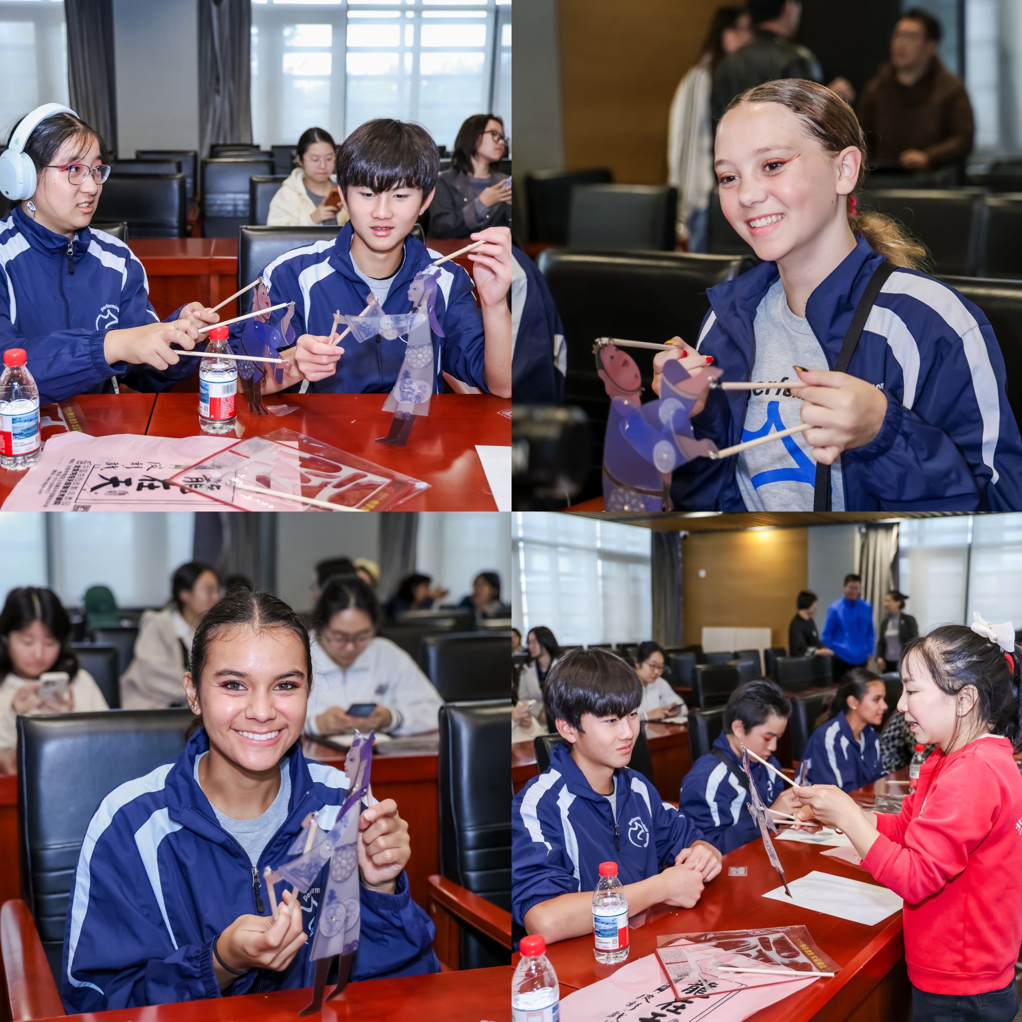 随后的互动体验环节将活动推向高潮。在皮影艺术家、北京龙在天皮影艺术剧院王熙院长的指导下,中美学生一起动手参与皮影制作与操纵实践。从描画图样、雕刻皮料到组装关节、学习操纵,大家在亲手实践中感受非遗技艺的匠心独运。多位学生党员主动担任翻译与协助角色,助力中美青少年在协作中完成皮影作品,展现出党支部同学在跨文化沟通中的组织力与引领力。