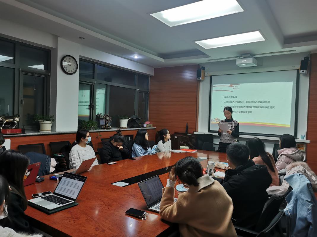 董芸芳介绍了本次会议的主要流程。在党员发展大会环节,王茗阅同学宣读了入党志愿书,汇报了自己对党的认识、入党动机、本人履历、思想和学习状况,表达了强烈的入党意愿。入党介绍人赵敏和周玥两位同志依次介绍了王茗阅的情况,表示王茗阅已经具备了一名中共预备党员的基本条件,愿意介绍其加入中国共产党。随后,组织委员史嘉瑶向大会报告了对王茗阅同志的审查情况。与会党员充分讨论了王茗阅同学的情况后,进行了无记名投票表决,全体正式党员(15名)一致同意接收其为中共预备党员。王茗阅同志进行了表态,表示在今后的学习和工作中,会时刻以党员的标准严格要求自己,发扬优点,改正不足,努力做到全心全意为人民服务。