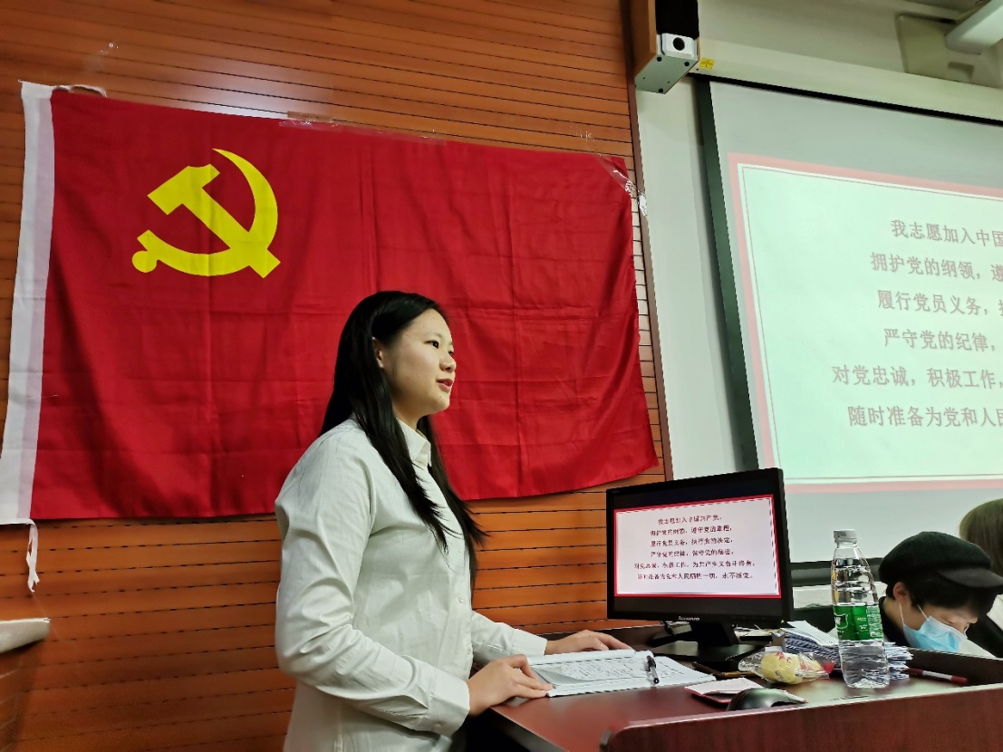 随后,孙琳同志带领支部上学期发展的预备党员面向党旗进行了入党宣誓,支部委员普靖同志、谭天歌同志为预备党员颁发党员证与党员徽章。