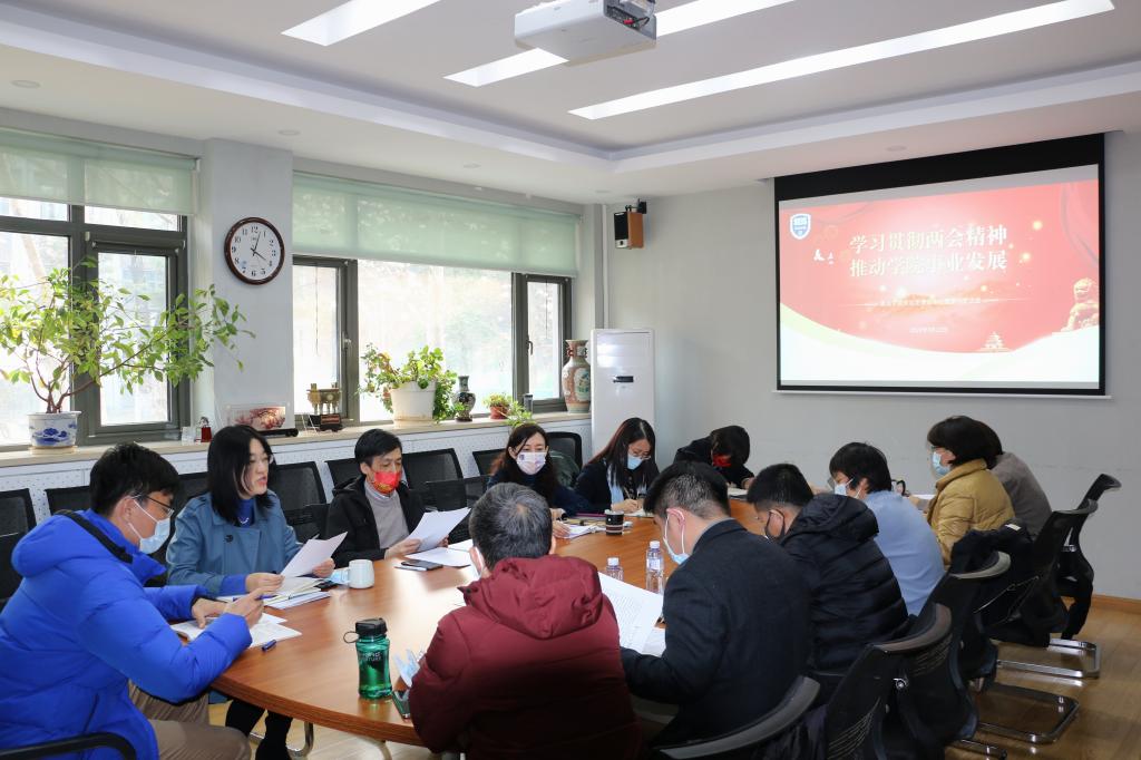 此次会议主题为学习贯彻两会精神 推动学院事业发展。与会人员围绕习近平总书记在2022年全国两会重要讲话精神、政府工作报告等内容,结合学院建设发展,进行了交流发言。