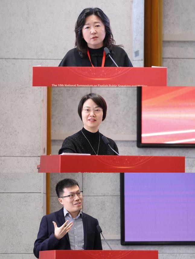 金利民教授以“讲述当代中国”虚拟仿真课程为例,展示如何融合AI语音评测与场景化实训,突破传统演讲教学模式,有效提升学生的国际传播实践能力。周杜鹃老师以《理解当代中国·英语演讲教程》教学实践为例,演示“以赛促教、以教优赛”的双向赋能机制,通过刻意训练与建构主义方法,提升学生演讲能力与思政素养。门椿林老师在议论文写作示范中,引导学生从情感表达、社会关切与自我认知三重维度切入,强调在AI时代守护“人之为人”的创作独特性,深化写作教学的人文内核。