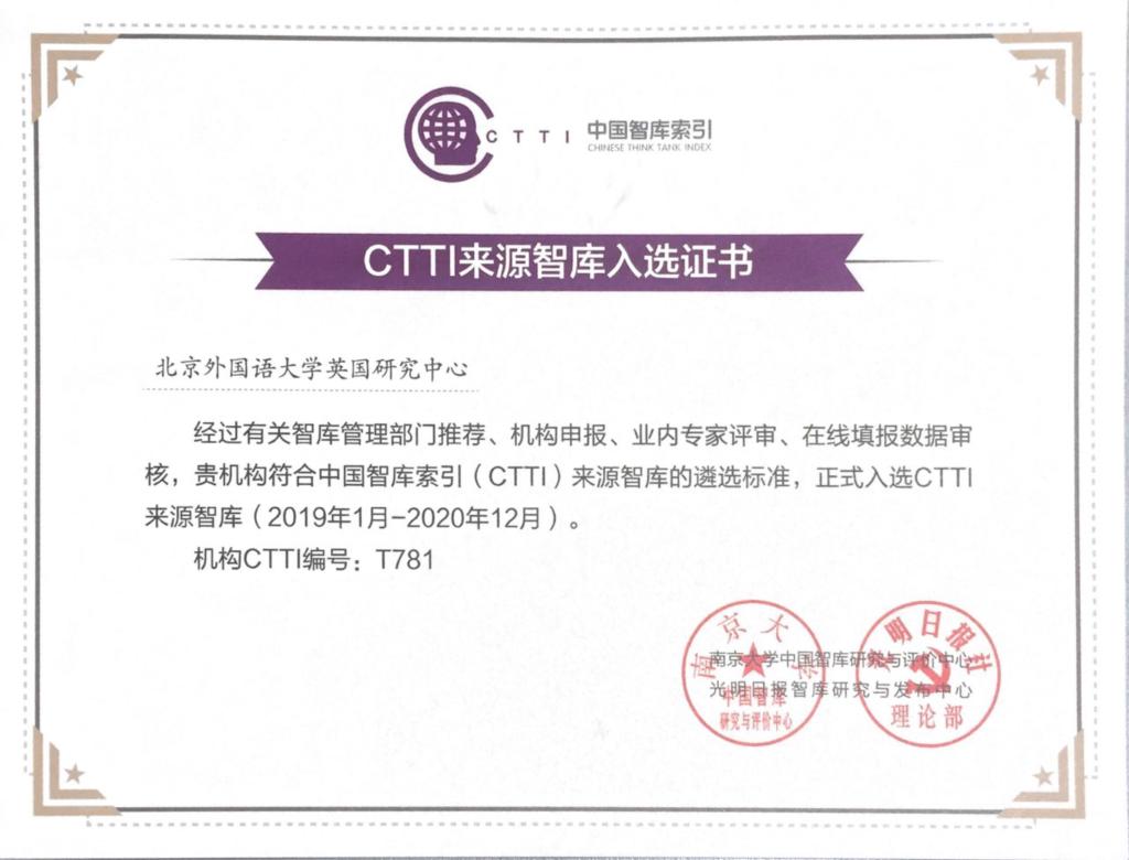 12月22日,由南京大学、光明日报社联合主办,南京大学中国智库研究与评价中心、光明日报智库研究与发布中心承办的“2018中国智库治理暨思想理论传播高峰论坛”在南京举行。北京外国语大学英国研究中心增补入选2018年CTTI来源智库。