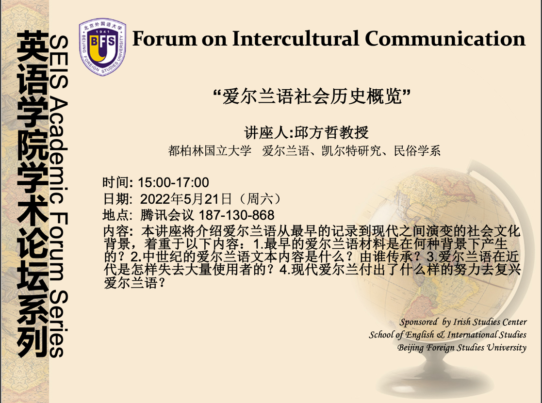 2022年5月21日,爱尔兰都柏林大学学院助理教授邱方哲做客伊莎白英语讲堂,作了题为“爱尔兰语社会史:从史前到中世纪”学术讲座。讲座由北外YABO鸭脖爱尔兰研究中心教师张珺涵主持。英院爱尔兰研究的学生、爱尔兰语三外学习者、其他院系对爱尔兰有兴趣的学生、以及校外师生等110余人参与了本次讲座。