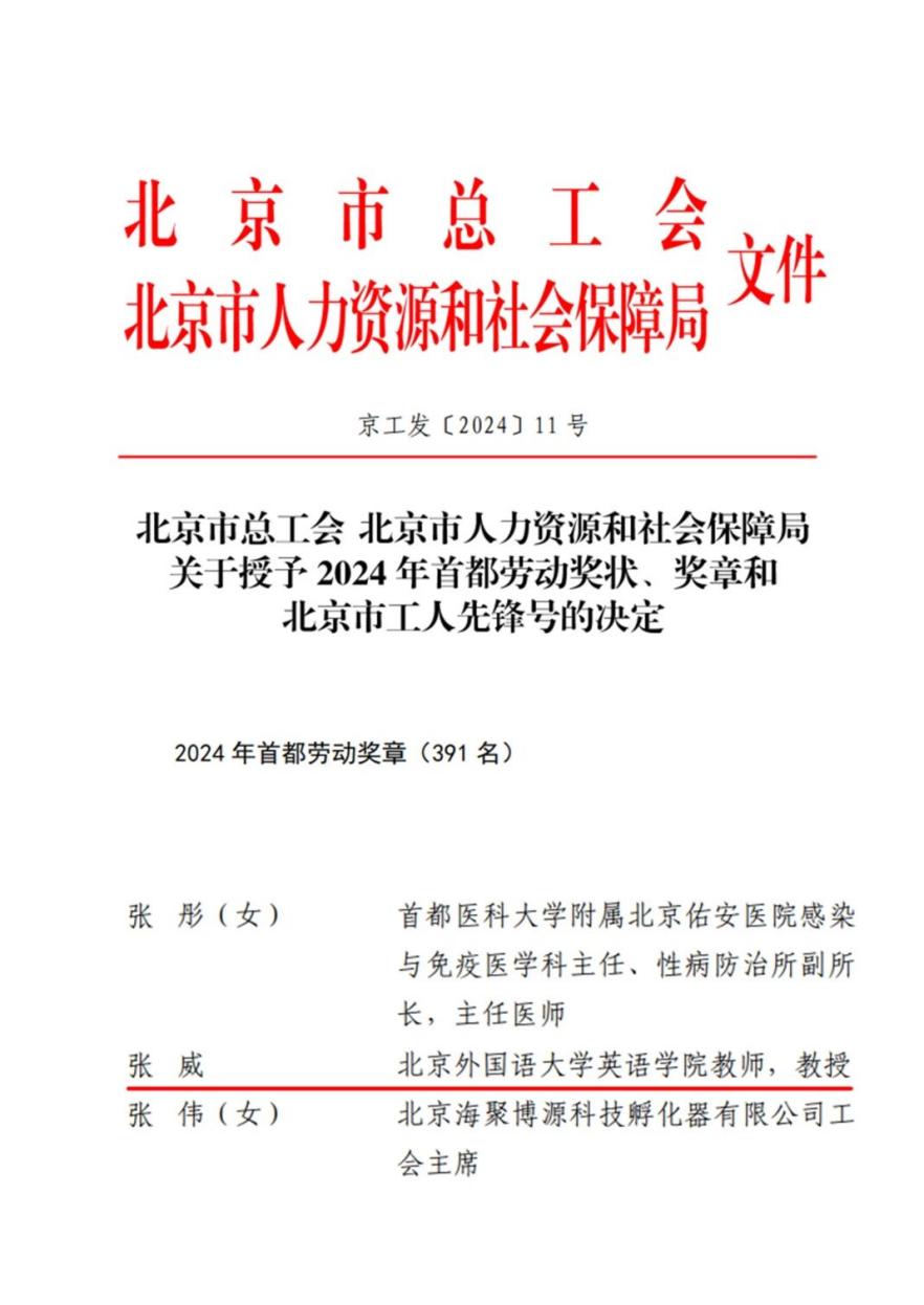 为深入学习贯彻党的二十大精神和中国工会第十八次全国代表大会精神,大力弘扬劳模精神、劳动精神、工匠精神,近日,北京市总工会、北京市人力资源和社会保障局在全市范围内开展2024年首都劳动奖状、奖章和北京市工人先锋号推荐评选工作,最终授予北京市76个单位“首都劳动奖状”称号,391名同志“首都劳动奖章”称号,授予148个班组(团队)“北京市工人先锋号”称号。YABO鸭脖张威教授荣获“首都劳动奖章”,这是北外教师首次获得该荣誉。