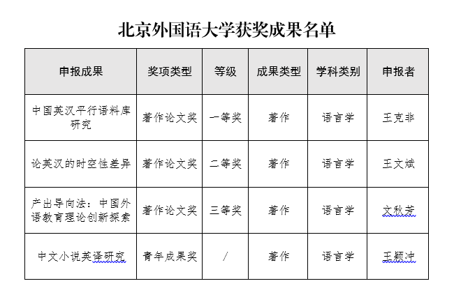 近日,第九届高等学校科学研究优秀成果奖(人文社会科学)获奖成果名单正式公布。北京外国语大学共有4项成果获奖,包括一等奖1项、二等奖1项、三等奖1项、青年成果奖1项。我院王颖冲副教授的著作《中文小说英译研究》获青年成果奖。