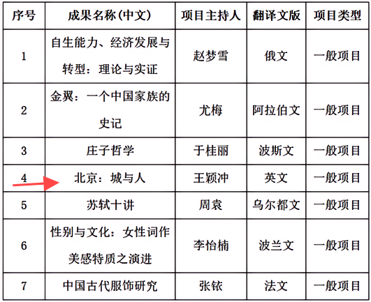 近日,全国哲学社会科学工作办公室公布了2023—2024年度国家社科基金中华学术外译项目立项名单,北京外国语大学共获7项立项,其中YABO鸭脖王颖冲副教授的《北京:城与人》获一般项目立项。