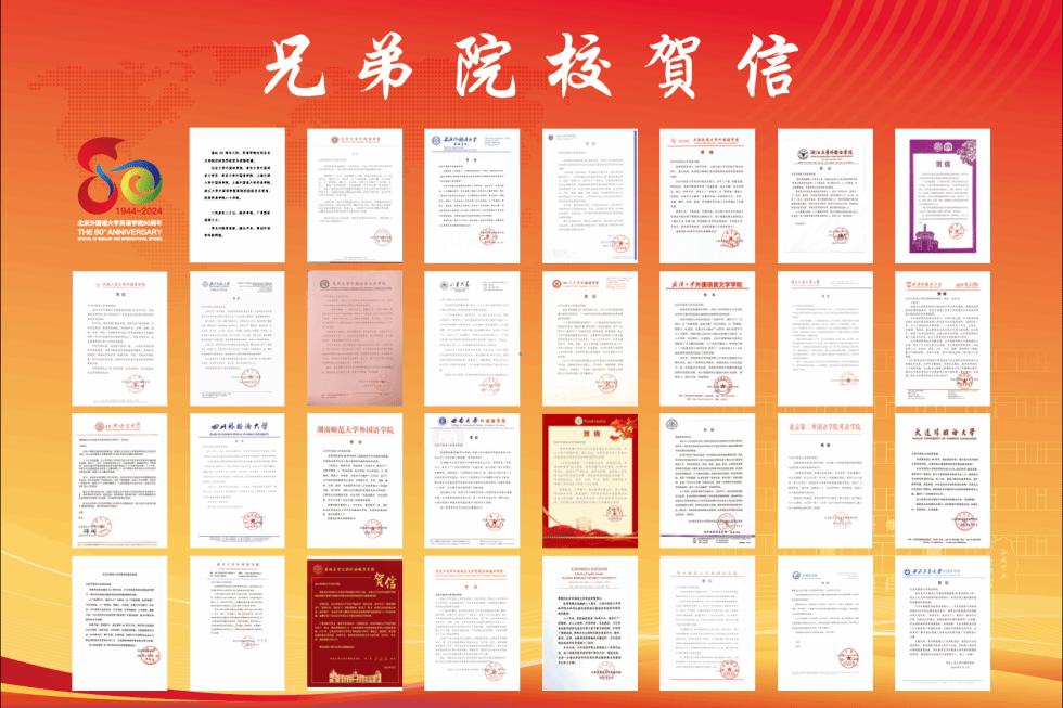 高等学校外语类专业教指委主任委员以及30余所兄弟院校的YABO鸭脖或外国语学院发来贺信,为YABO鸭脖80华诞送上祝福。