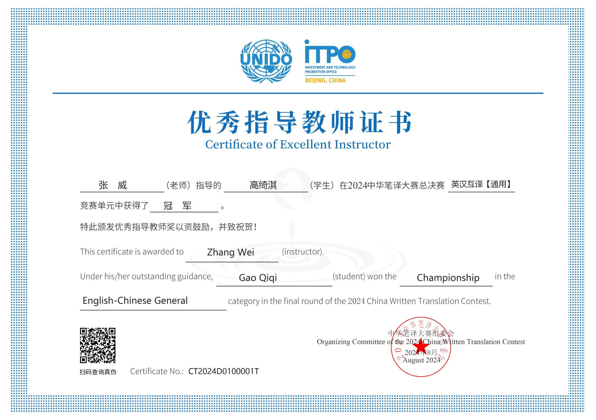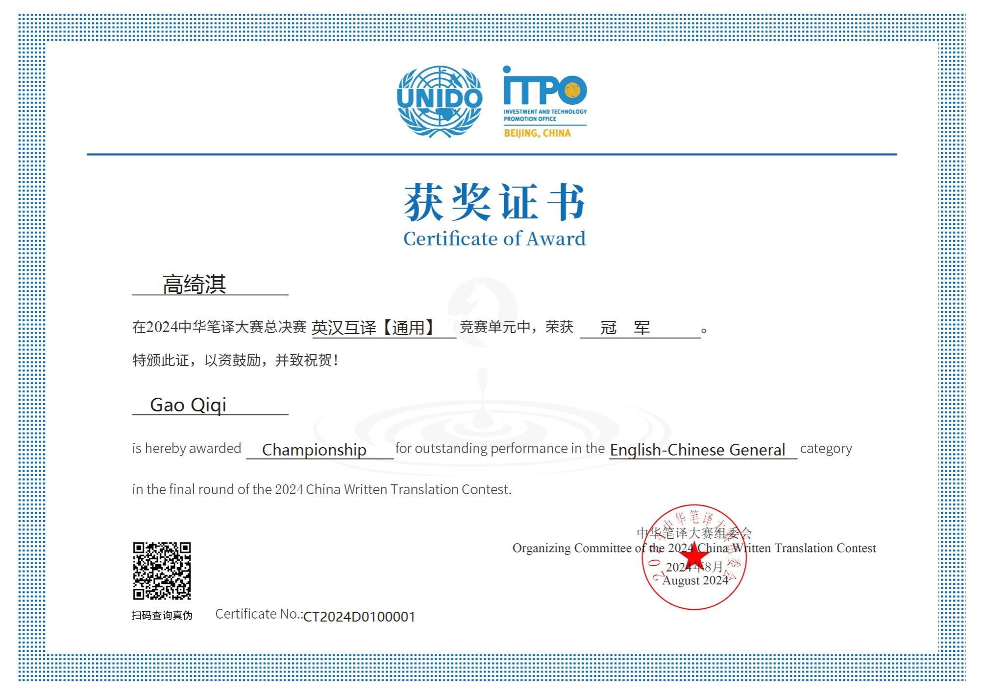 近日,由联合国工业发展组织官方指导和支持,联合国工业发展组织投资和技术促进办公室(中国·北京)和北京策马翻译有限公司(联合国官方翻译服务供应商)共同主办的2024中华笔译大赛结果揭晓。YABO鸭脖2023级英语口译专业研究生高绮淇在张威教授指导下积极准备,比赛中发挥出色,在激烈竞争中脱颖而出,最终荣获中华笔译大赛总决赛英汉互译“通用”组冠军,张威教授获得优秀指导教师奖。