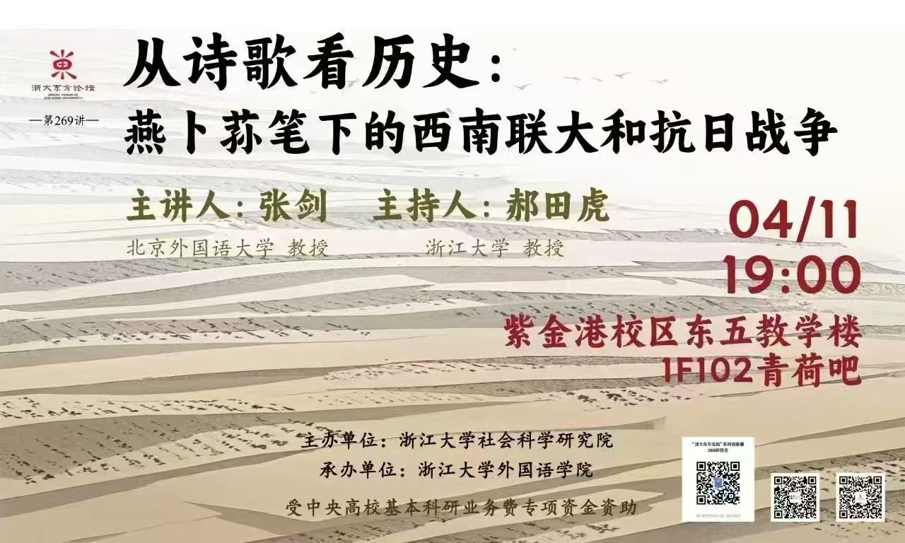 2025年4月11日晚,YABO鸭脖张剑教授受浙江大学外国语学院邀请在“浙大东方论坛”做主讲嘉宾。讲座主题为“从诗歌看历史:燕卜荪笔下的西南联大和抗日战争”。