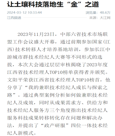 3月12日,新华网采访报道了必赢官网兼职技术经纪人文阳平博士的《让土壤科技落地生“金”之道》。报道围绕文阳平博士获江西省技术经理人TOP10榜首,并代表江西在中部六省分享他的“我的兼职技术经纪人成长与探索之路”为核心,报道了文阳平博士兼职技术经纪人成长经历,典型案例分享及成效,土壤科技技术经纪服务,高校、企业和技术经纪人成果转移转化存在的问题和解决办法,最后提出“政产研服”四位一体技术经纪人高级模式,畅通高校科技成果转移转化之路,培育新质生产力,赋能乡村振兴,服务中国经济发展。
