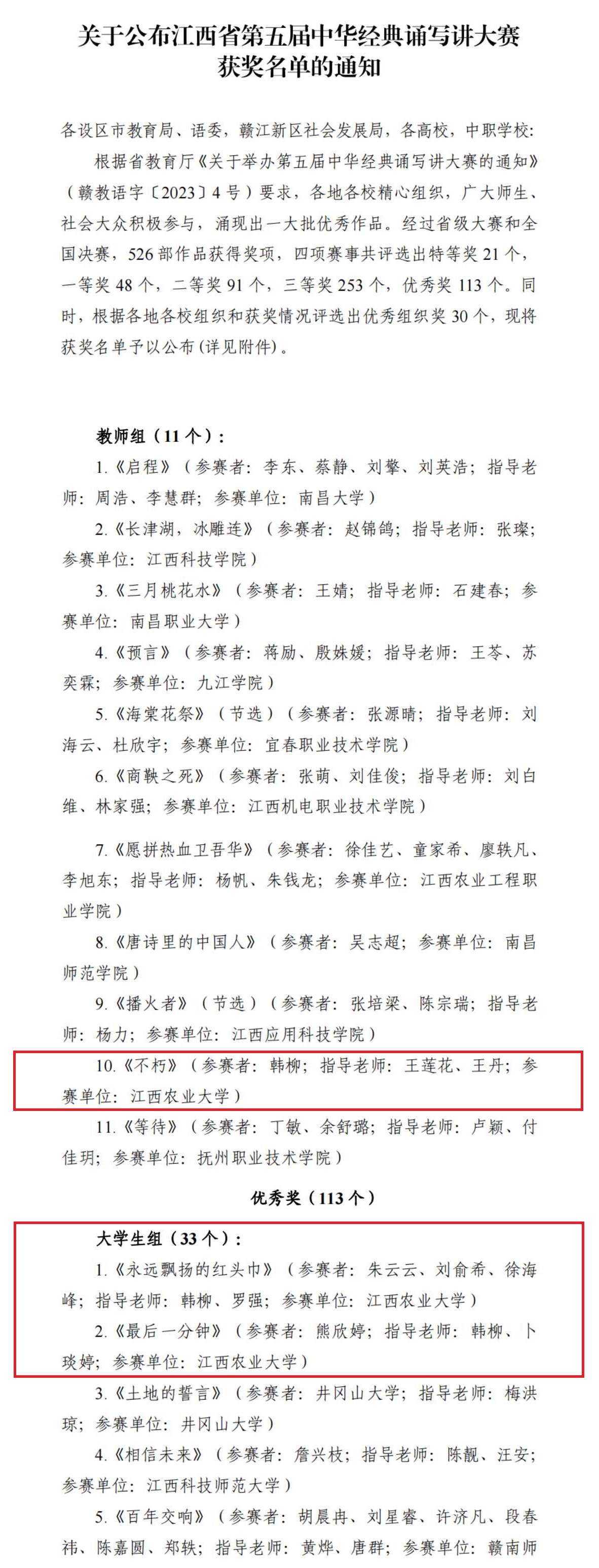 2024年3月6日,江西省教育厅公布了江西省第五届中华经典诵写讲大赛获奖名单,学院团委书记韩柳的朗诵作品《不朽》获得教师组三等奖,指导的作品《永远飘扬的红头巾》和《最后一分钟》获得大学生组优秀奖。