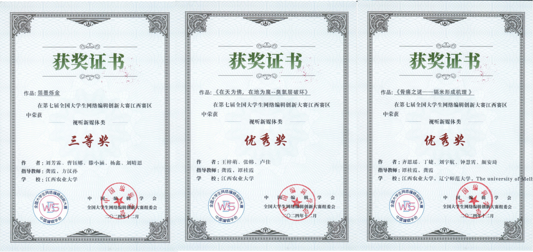 必赢官网教师指导的作品在第七届全国大学生网络编辑创新大赛江西赛区荣获3项奖。由龚霞、方汉孙老师指导的作品《箔墨烁金》获得三等奖;龚霞、谭桂霞老师指导的作品《在天为佛,在地为魔—臭氧层破坏》获得优秀奖;谭桂霞、龚霞老师指导的作品《骨痛之谜—镉米形成机理》获得优秀奖。