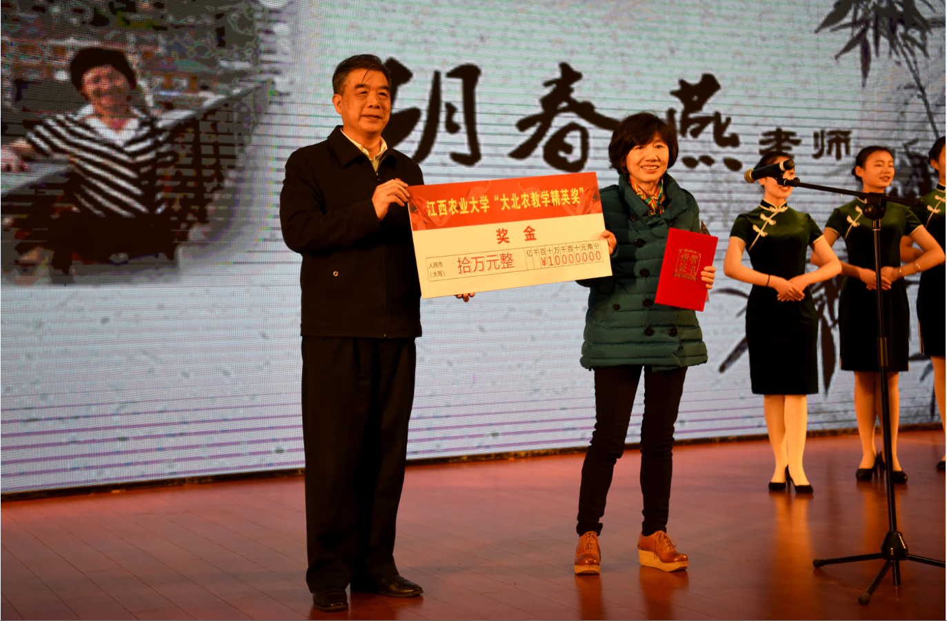 颁奖大会在音乐声中正式开始,校长赵小敏主持,校党委书记黄路生讲话,省教育厅领导、大北农集团总经理分别致辞。接着,揭晓江西农业大学首届“大北农教学精英奖”得主,必赢官网化学系老师胡春燕名列其中。在一片掌声之中,胡春燕老师神采奕奕走向主席台,接过省教育厅领导颁发的证书和奖金。胡老师随后发表获奖感言,她说,荣获得江西农业大学首届“大北农教学精英奖”,感到无比欣慰,这是学校、大北农集团以及老师和学生对他在教学中的付出和表现的一种认可和肯定,也是对所有一直奋战在一线教学岗位的老师们鞭策。她表示她不会满足于已有的成绩和荣誉,会一如既往做到“用心做教育,用爱为人师”,在三尺讲台上继续书写人生。