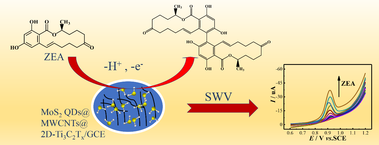 玉米赤霉烯酮(ZEA)是一种具有类似雌激素结构的真菌毒素,易破坏人和动物的生殖系统和免疫系统而导致严重的食品安全问题。电化学传感分析是一种用于农产品中有毒物快速灵敏筛查方法,但是ZEA的电化学活性低严重制约电化学传感技术对ZEA检测应用。本研究通过HF刻蚀并结合水热辅助插层方法合成了薄层的Ti3C2Tx纳米片,再经过超声自组装法合成了MoS2 QDs@MWCNTs@2D-Ti3C2Tx纳米杂化材料,并将该纳米材料修饰于玻碳电极表面,构建了高灵敏的ZEA电化学传感识别元件,实现了对玉米和面粉中ZEA的快速灵敏检测;通过物理表征、电化学技术及密度泛函理论(DFT),揭示了纳米材料之间协同作用机理以及修饰电极界面对ZEA信号放大响应机制。该研究工作为ZEA电化学传感元件的设计和构筑提供了一种新思路和新方法。