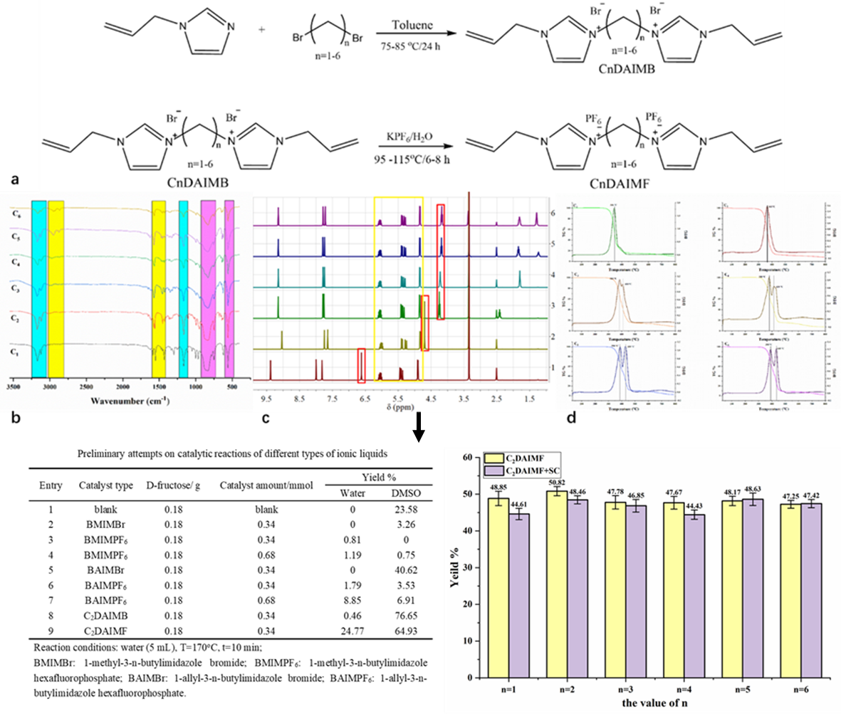 离子液体具有易功能化的特点,有望成为制备5-HMF的催化剂和溶剂,为解决5-HMF制备工艺存在选择性低、设备腐蚀、成本高和产物分离困难等问题提供思路与途径。该论文以两步合成法有效地合成了热稳定性好(HTD≥340℃)的目标离子液体(CnDAIMF),并将其进行了红外光谱、1H NMR、单晶衍射等表征。同时,将其成功应用于催化果糖转化制备5-HMF中,表明其在生物质转化中具有良好的应用前景,且亦有利于功能化离子液体的研究。
