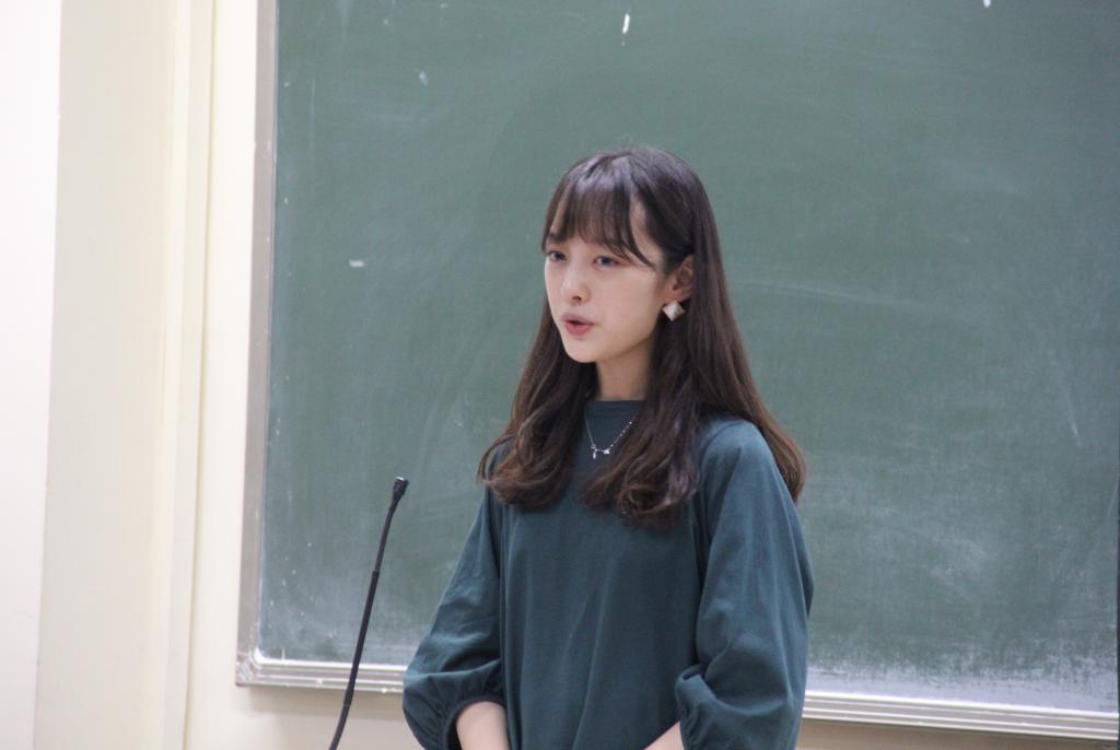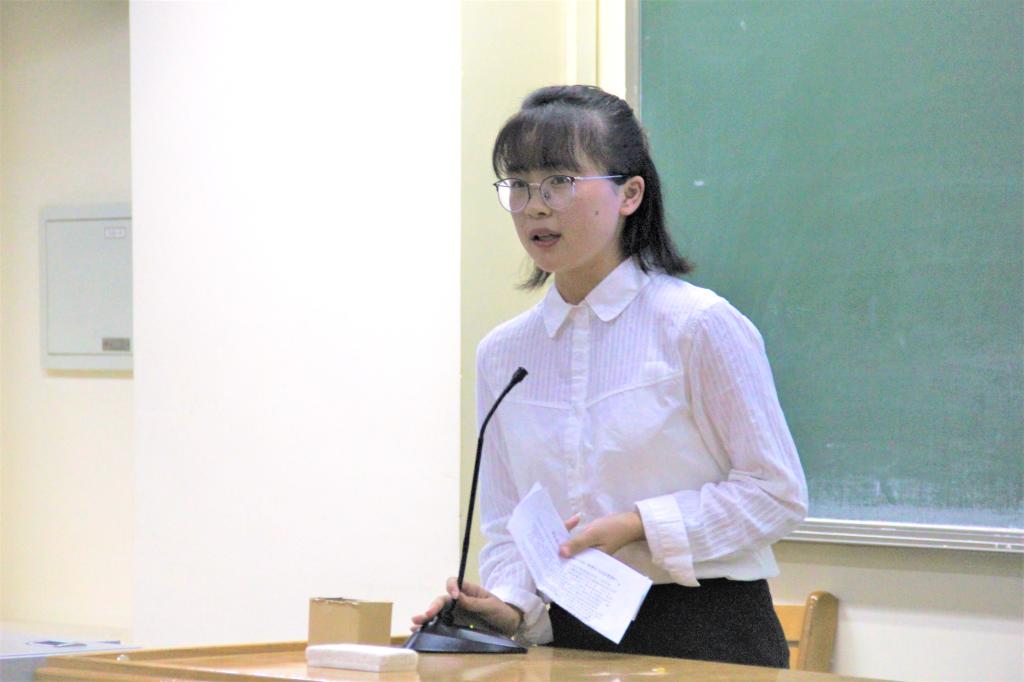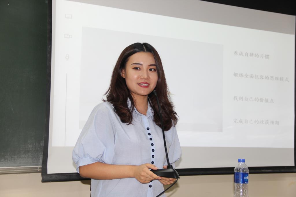 接着,部长团成员代表文艺部部长杨玲部长上台发言。她对新成员的加入表示热烈欢迎并建议他们学习处理好部门内部、院系间乃至与校外主体的关系;及时回复消息,注重工作中的处事礼仪;学会应对突发状况,积累经验。最后,杨玲部长期待新成员们在团学联收获成长与情谊的同时能有优秀的表现。