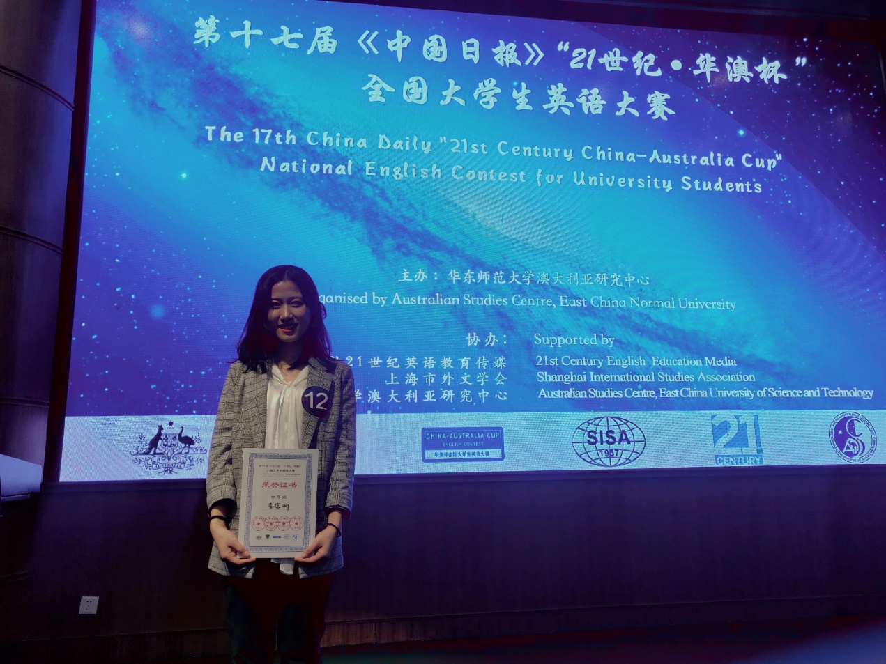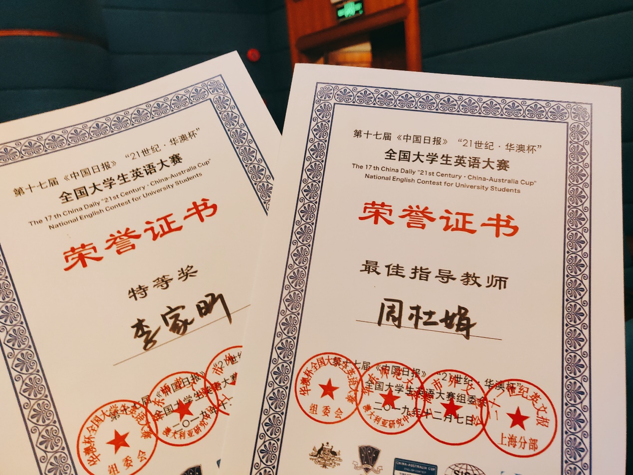 12月7日,由华东师范大学澳大利亚研究中心主办,中国日报21世纪英文报、上海市外文学会、华东理工大学澳大利亚研究中心协办的第十七届《中国日报》“21世纪·华澳杯”全国大学生英语大赛圆满落幕。我校YABO鸭脖2017级本科生李家昕在26所高校选手中脱颖而出,夺得冠军,荣获特等奖。周杜娟老师获最佳指导老师。