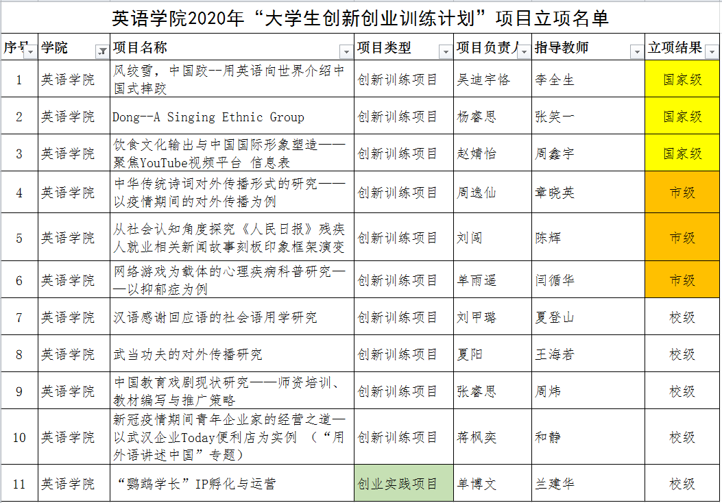 2020年“大学生创新创业训练计划”立项评审工作已经结束,我院共有11个获得立项,其中“创新训练项目”10个,“创业实践项目”1个。国际级项目3项,市级项目3项,校级项目5项。分别是:吴迪宇格、杨睿思、赵婧怡、周逸仙、刘闯、单雨遥、刘甲璐、夏阳、张睿思、蒋凤奕、单博文。具体情况如下表: