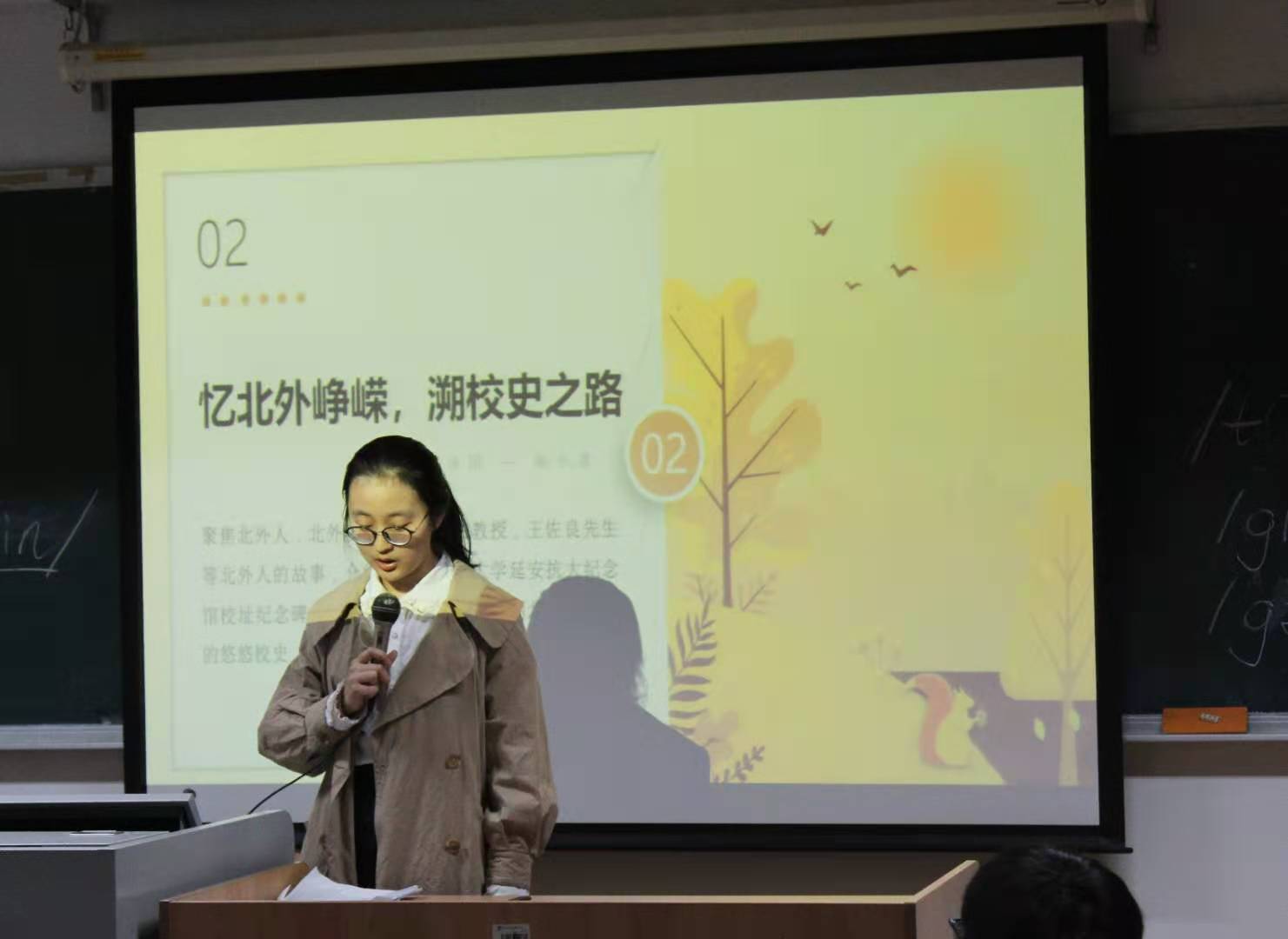 阿拉伯语学院2019级叶鸿翔介绍了学校的历史沿革,带领新生同学回溯北外校史,通过校史延伸至国家对外政策的变迁,折射出中国外交史上的起起落落。校史、国史、外交史是一个命运共同体,北外学子当以饱满的姿态投入学习,将专业技能应用到人民和祖国需要的地方,为学校的发展和祖国的复兴贡献力量。