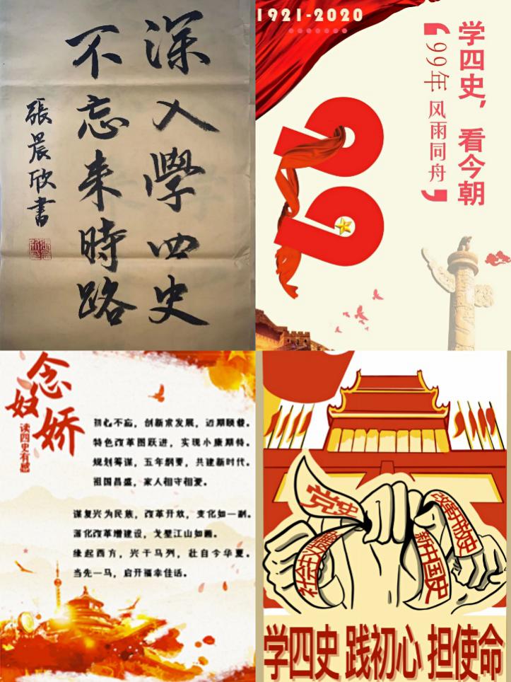 (左上为张晨欣同学的主题书法,左下为王安然同学的主题征文,右上为于靖懿同学的主题海报,右下为廖诗玮同学的主题绘画)