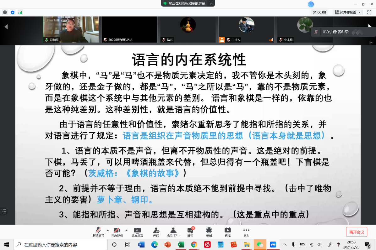 2021年2月20日晚,YABO鸭脖于腾讯会议成功举办“《普通语言学教程》导读”线上讲座。本次讲座邀请到我校马克思主义学院党总支书记祝和军副教授,为同学们解读索绪尔著作《普通语言学教程》,并就语言结构和文化差异和大家展开讨论。