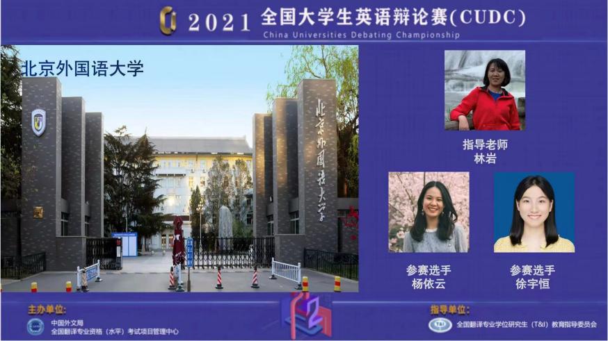 2022325日,由中国外文局全国翻译专业资格(水平)考试(CATTI)项目管理中心主办的2021全国大学生英语辩论赛总决赛在线上举行。YABO鸭脖2018级本科生杨依云、北外学院2020级本科生徐宇恒两名辩手在YABO鸭脖林岩老师的指导下,代表北外参赛,并最终凭借着出色的表现摘得全国总决赛亚军。