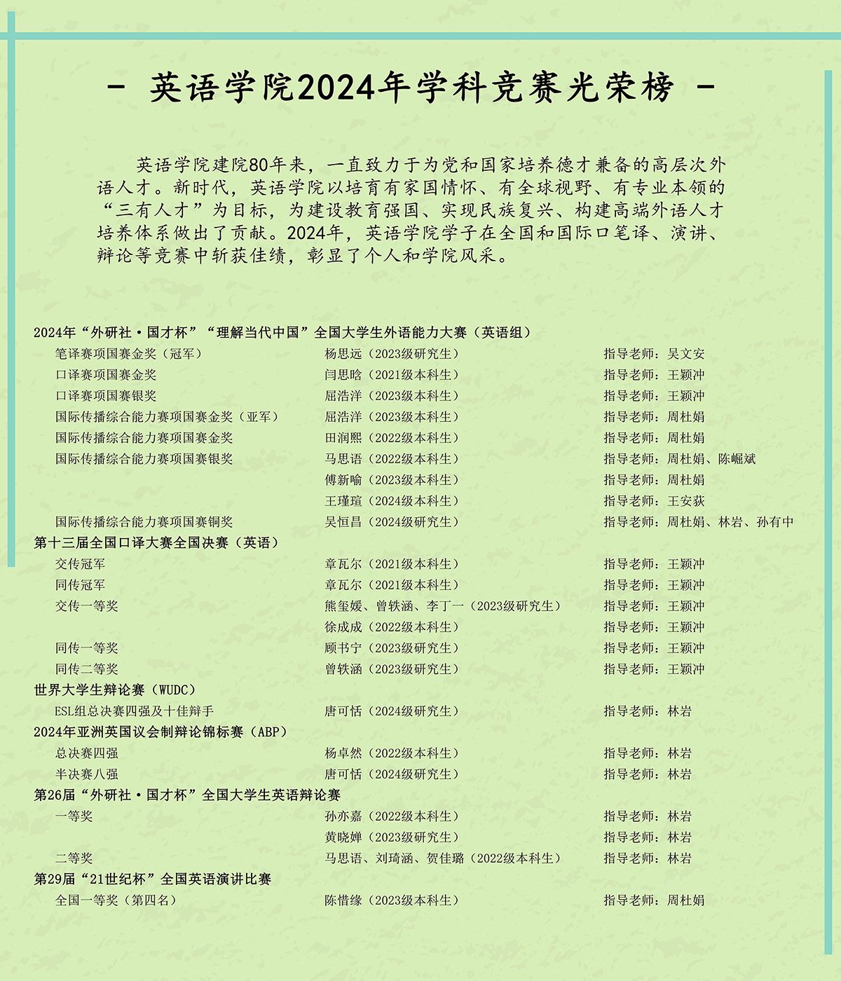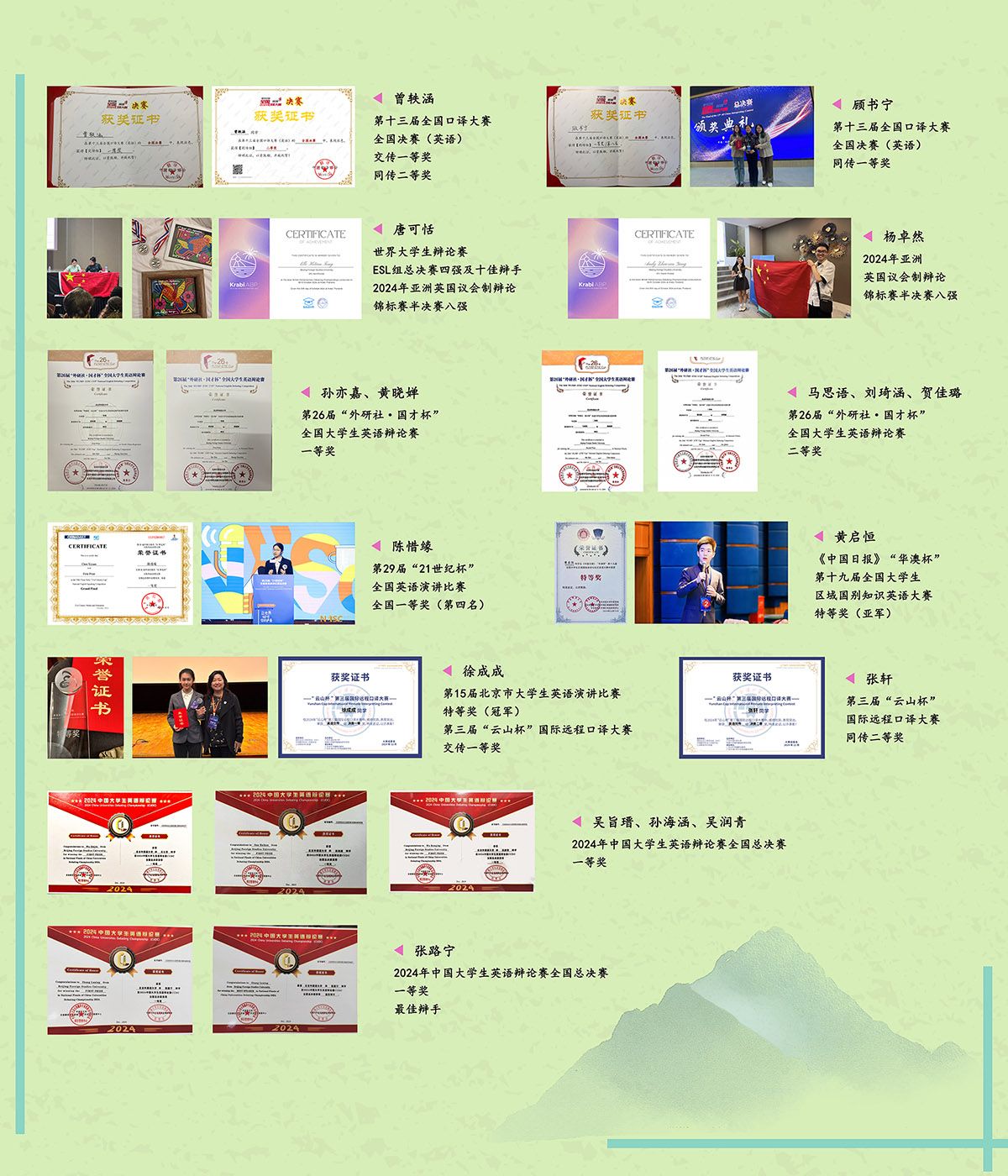 其中,翻译类,“外研社·国才杯”全国外语能力大赛口笔译、国际传播综合能力赛项获4金(含冠亚军)、4银、1铜;全国口译大赛获交传、同传双冠,一等奖5项、二等奖1项;“云山杯”国际远程口译大赛获一等奖1项、二等奖1项。辩论类,晋级世界大学生辩论赛ESL组总决赛,创造中国队伍在该赛事上的历史最佳成绩;亚洲议会制辩论赛跻身总决赛四强;“外研社·国才杯”全国大学生英语辩论赛获一等奖2项、二等奖3项;中国大学生英语辩论赛获一等奖4项。演讲类,“21世纪杯”全国英语演讲比赛获一等奖1项;北京市大学生英语演讲比赛获冠军。全国大学生区域国别知识英语大赛获亚军。